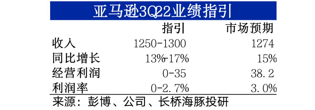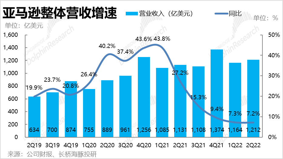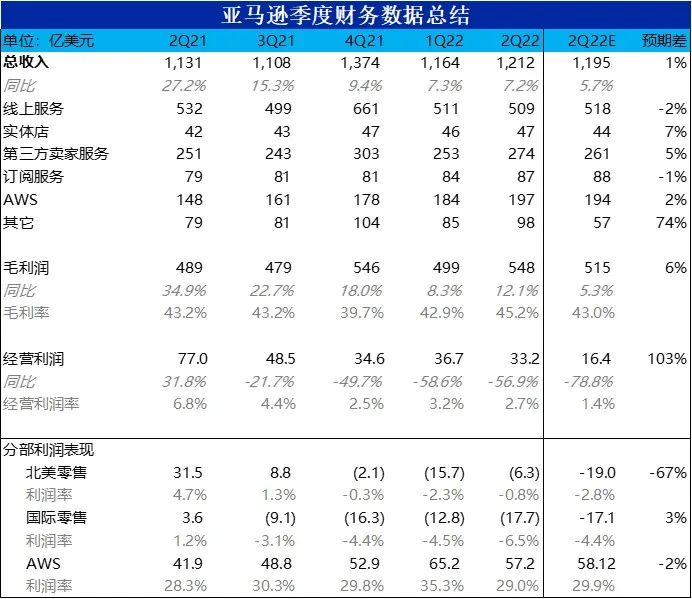 首先從整體來看,亞馬遜2Q22總營收1212億美元,同比增長7.2%,增速與上季度相當,并未如預(yù)期中繼續(xù)放緩。此外本季實際營收也超過了公司指引上限的1210億和市場預(yù)期中值的1195億。
