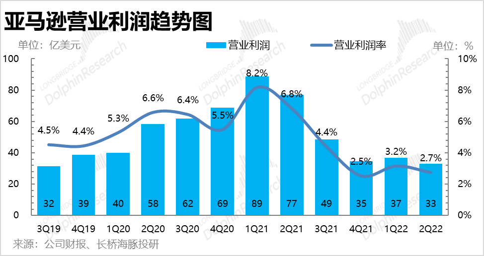 本季毛利率顯著改善,達45.2%,不僅環(huán)比改善,同比也提升2pct。海豚認為,毛利改善,首先是公司通過FBA提價多次及對北美Prime會員的漲價,轉(zhuǎn)移成本壓力的效果良好。此外,本季度公司果斷裁員高達10萬人左右(其中大部分應(yīng)為快遞人員),資本投入增速也放緩到8.5%,進一步減輕了成本壓力。