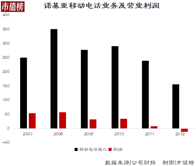 2012年的諾基亞,已經(jīng)到了將總部大樓售后回租以降低成本的地步。2013年,諾基亞手機(jī)業(yè)務(wù)收入從2009年的278.53億歐元降至107.35億歐元,利潤(rùn)自2012年起由盈轉(zhuǎn)虧,僅一年就虧了14.8億歐元。