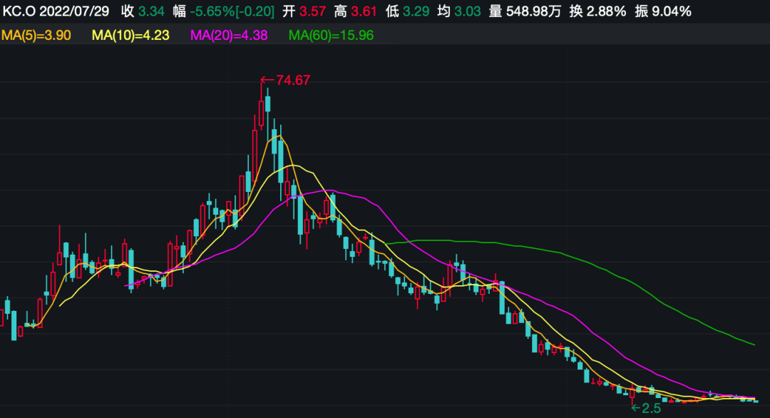 2020年5月,金山云登陸納斯達克,上市首日漲超40%。然而,半年后,金山云的股價走勢就來到了拐點,并急轉(zhuǎn)直下,較高點跌超95%。
