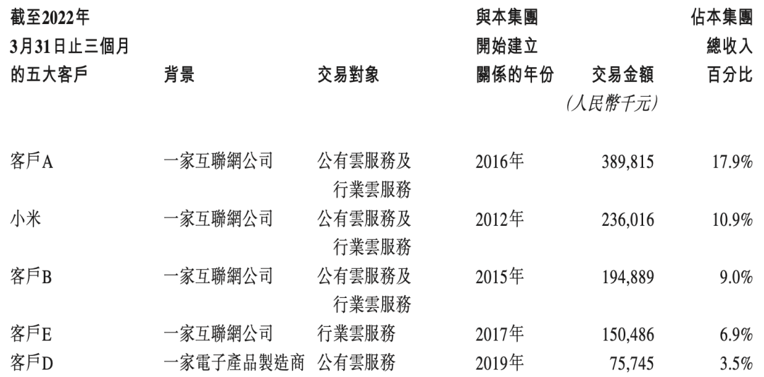 客戶和優(yōu)質(zhì)客戶看起來都不少,但實際上,金山云的主要營收多半都是由前五大客戶貢獻的?!墩泄蓵凤@示,2019年-2021年以及截至2022年3月31日止三個月,金山云的前五大 客戶合共分別占其總收入的65.7%、61.5%、50.5%及48.2%。其中,最大客戶分別占金山云總收入的約30.9%、28.1%、21.9%及17.9%。