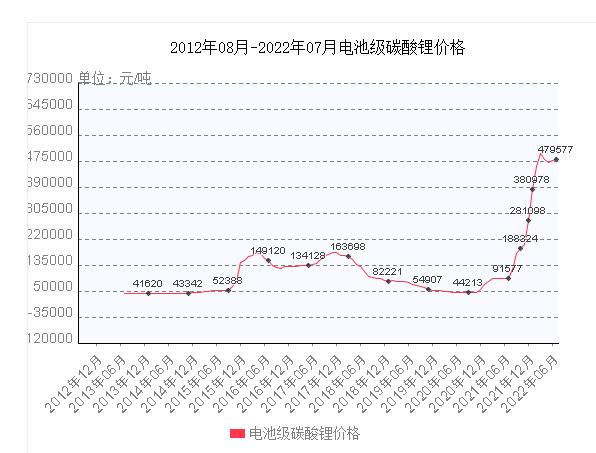 數(shù)據(jù)顯示,國內(nèi)電池級碳酸鋰7月價(jià)格維持在47萬元/噸左右,而這一數(shù)字在去年年初徘徊在5萬元/噸,不到一年半的時(shí)間里整整翻了10倍。