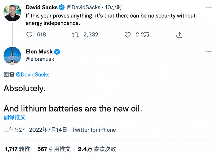 馬斯克表示:“鋰電池就是新的石油?!?/p>