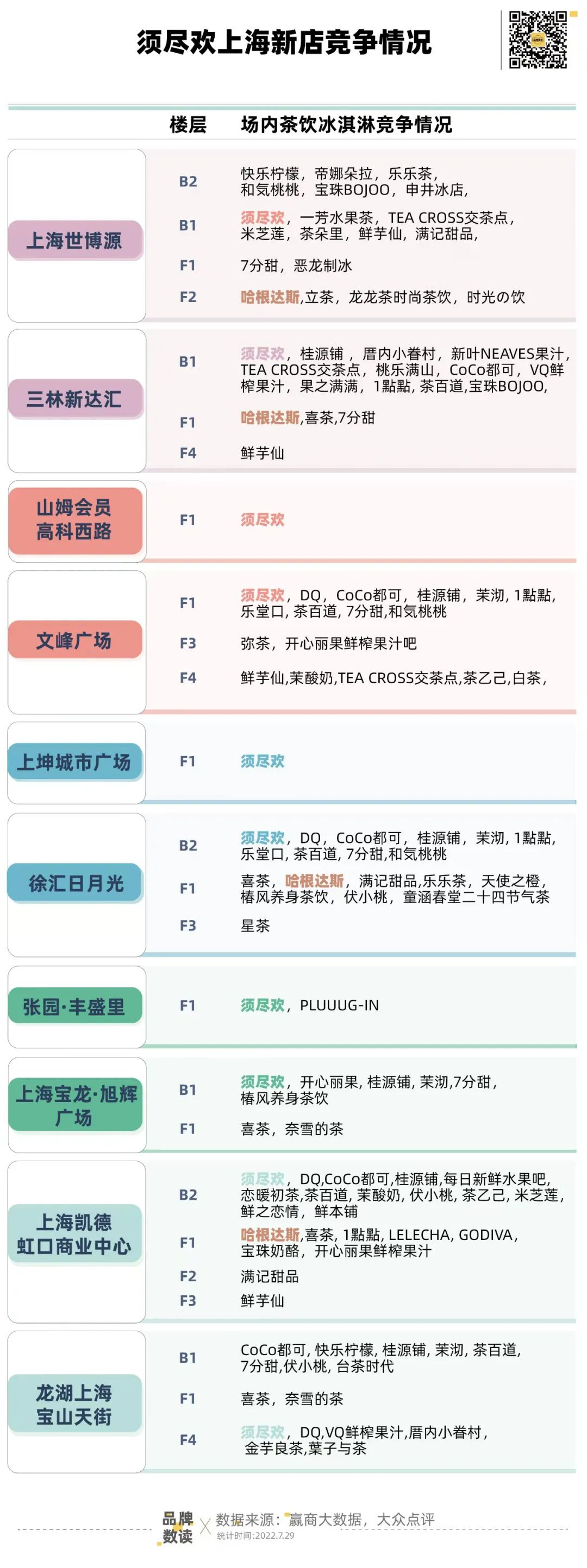 在同層中,拋開上坤城市廣場和山姆會(huì)員高科西路兩家店,三林新達(dá)匯(CoCo都可、1點(diǎn)點(diǎn)、桂源鋪)、文峰廣場(CoCo都可、1點(diǎn)點(diǎn)、桂源鋪)、徐匯日月光廣場(CoCo都可、1點(diǎn)點(diǎn)、桂源鋪)、上海寶龍·旭輝廣場(桂源鋪)、上海凱德虹口商業(yè)中心(CoCo都可、桂源鋪)幾家購物中心里中端價(jià)格帶的品牌扎堆,CoCo都可、桂源鋪和一點(diǎn)點(diǎn)頻繁與須盡歡碰面。