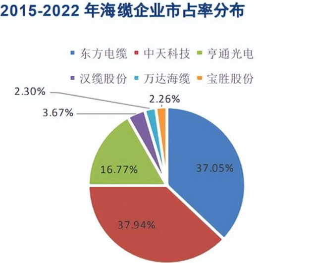 海纜得益于較高的行業(yè)壁壘和進入壁壘,目前市場高度集中,參與者較少,行業(yè)格局較為穩(wěn)定。統(tǒng)計 2015-2022年5月海纜市場參與者的中標金額可知, 當前一線龍頭東方電纜市占率37%、一線龍頭中天科技市占率 38%,龍三亨通光電市占率 17%,合計前三家頭部廠商已獲得91.7%左右市場份額,其余市場份額基本被漢纜股份、萬達海纜和寶勝股份瓜分。