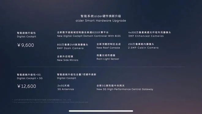 其中,蔚來的硬件升級計劃相比其他車企的價格更貴,共提供9600元或12600元人民幣的兩種選擇,第一套為智能座艙升級包,包括高通8155芯片、四顆300萬像素攝像頭、800萬行車記錄儀等。第二套則為5G版智能座艙升級包,在前者的基礎(chǔ)上增加了5G天線和5G中央網(wǎng)關(guān)。這兩項硬件升級計劃主要針對老款的ES8、ES6、EC6。