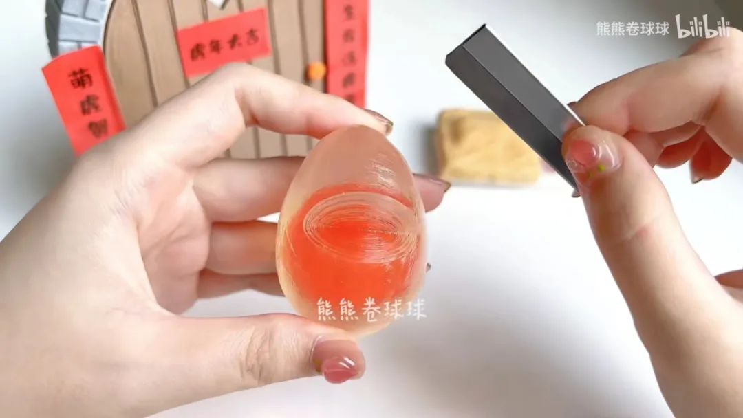 在熊熊卷球球制作的《擠痘模擬器》視頻里,有一個(gè)光滑的、金黃色的大球,輕輕切開(kāi)一個(gè)小口,藏在里面的水寶寶一股腦沖了出來(lái)。而在另一個(gè)《咸鴨蛋膠帶球》的視頻中,熊熊做了一個(gè)晶瑩剔透的鴨蛋,輕輕割開(kāi)透明的“蛋清”,里面橙色的鴨蛋黃逼真得像是要流油。