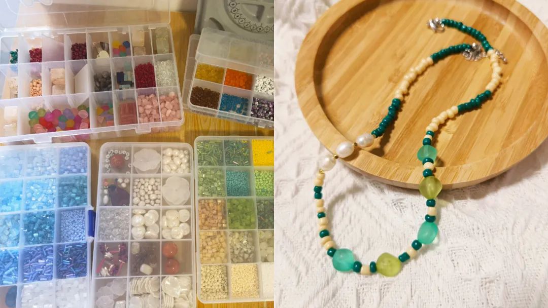 “90后小時(shí)候就玩串珠,現(xiàn)在串珠博主們都調(diào)侃說(shuō),玩這東西的是還那一批人的,只不過(guò)是我們長(zhǎng)大了?!崩铥愒诳戳藷o(wú)數(shù)個(gè)博主的串珠視頻后,決定自己買(mǎi)材料來(lái)試著做項(xiàng)鏈。淘寶、拼多多、1688等平臺(tái)都有類(lèi)似的商家,珠子本身的價(jià)格并不貴,直徑為幾毫米的小米珠,一兩塊能買(mǎi)一小盒,稍微特別點(diǎn)的珠子也只要一兩塊一顆。