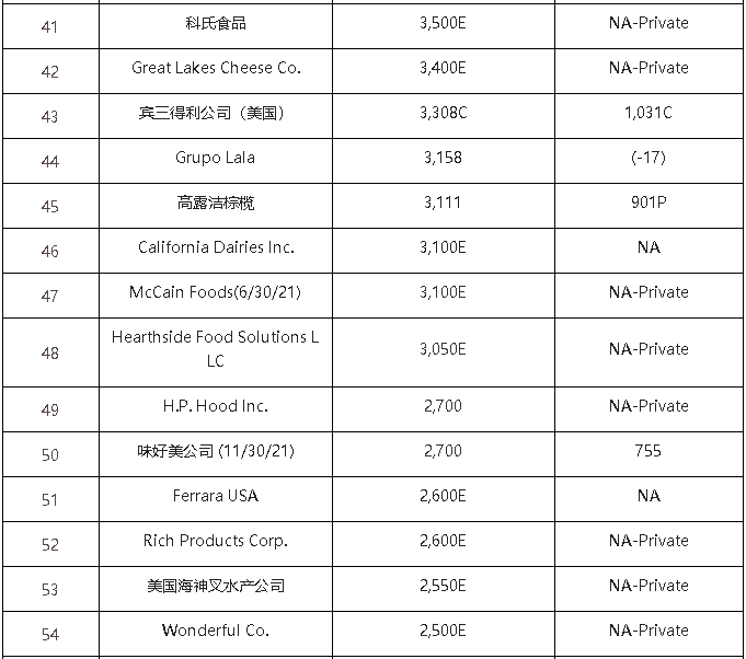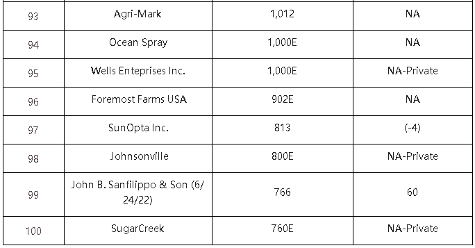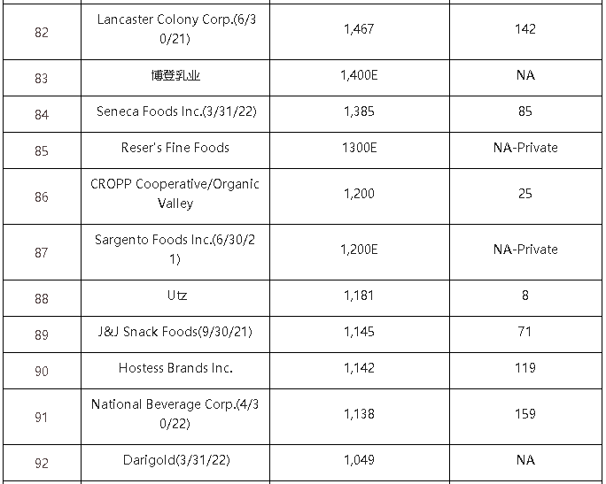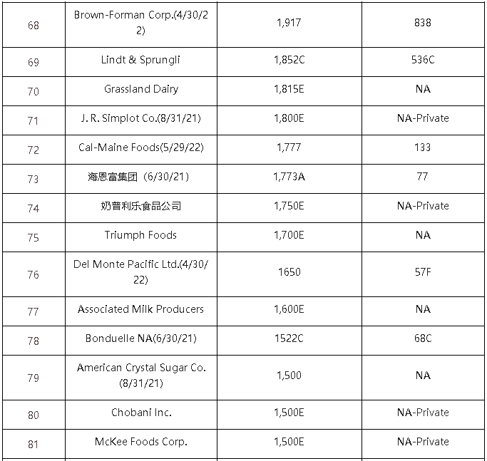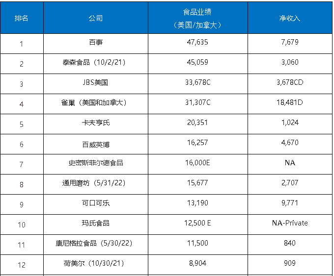 2022年的北美食品飲料TOP10的入榜企業(yè)基本沒有變化。