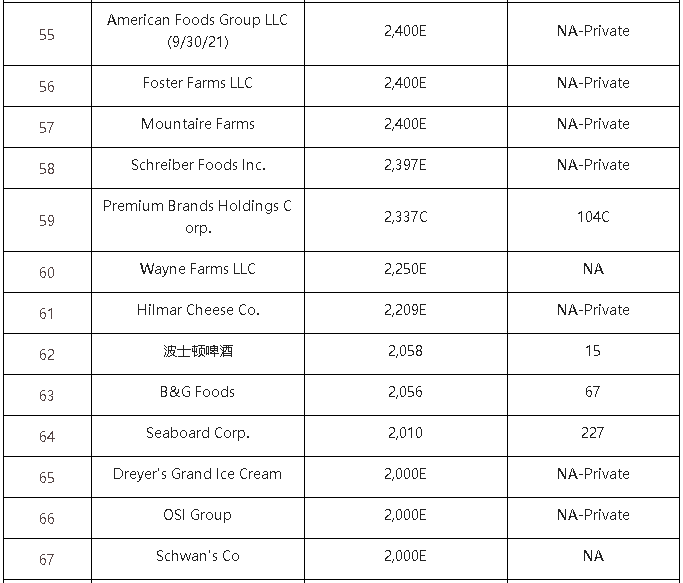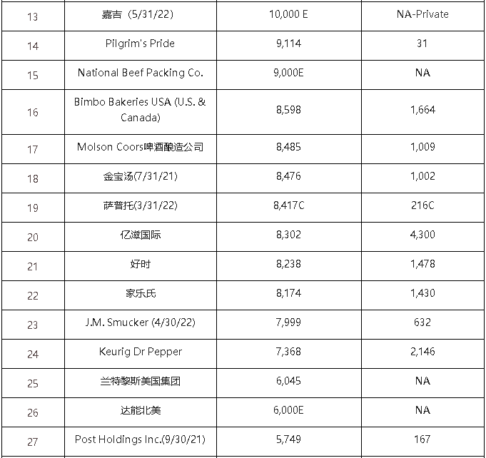今年仍位列第6、7名的百威、史密斯菲爾德在2021年的北美收入增長放緩,分別增長約6億和4億美元。