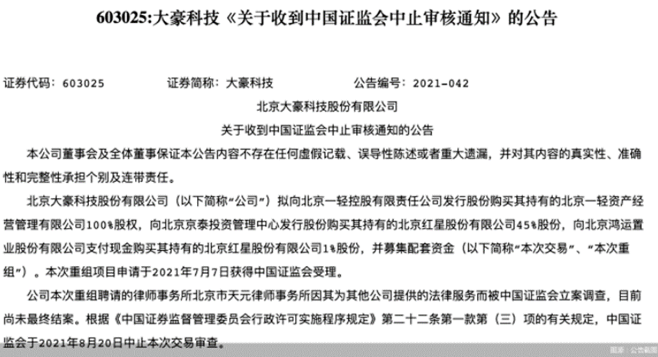 不過在去年8月21日,變故徒生。因律師事務(wù)所被立案調(diào)查未結(jié)案,大豪科技跨界收購(gòu)紅星項(xiàng)目被叫停,上市日程再次被拉長(zhǎng)。