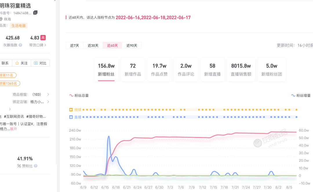 去年11月22日,“明珠羽童精選”發(fā)布了第一條視頻,8天時(shí)間,賬號(hào)漲粉至10萬。但此后,粉絲增長緩慢,據(jù)灰豚數(shù)據(jù),至5月31日,該賬號(hào)粉絲增長至67萬。6月至今,“明珠羽童精選”粉絲已漲至234萬。銷售數(shù)據(jù)方面,自6月9日至今的60天時(shí)間,“明珠羽童精選”直播銷售額達(dá)到8015.8萬元。