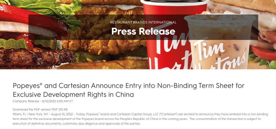 剛剛,炸雞連鎖Popeyes母公司Restaurant Brands International(下稱:RBI)宣布,其已與笛卡爾資本簽訂一份關(guān)于未來(lái)幾年在中國(guó)獨(dú)家發(fā)展Popeyes品牌(中文名:博派斯)的不具約束力條款清單。交易完成仍要取決于最終文件的執(zhí)行、慣常盡職調(diào)查和各方批準(zhǔn)。