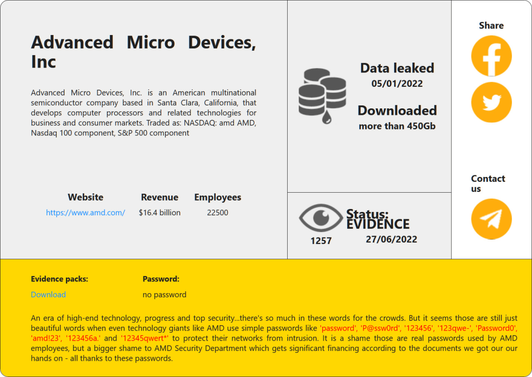 兩個(gè)月以前,芯片大廠AMD公司450Gb數(shù)據(jù)泄露事件被曝光。而黑進(jìn)其內(nèi)部系統(tǒng)的黑客聲稱,破譯AMD內(nèi)部員工設(shè)置的登陸權(quán)限密碼只用了不到5分鐘。這并非用了什么高科技的黑客技術(shù),相反,只是因?yàn)锳MD員工設(shè)置的密碼過于簡單,簡單到直接用“password”“123456”這種毫無腦回路的排列組合做密碼。