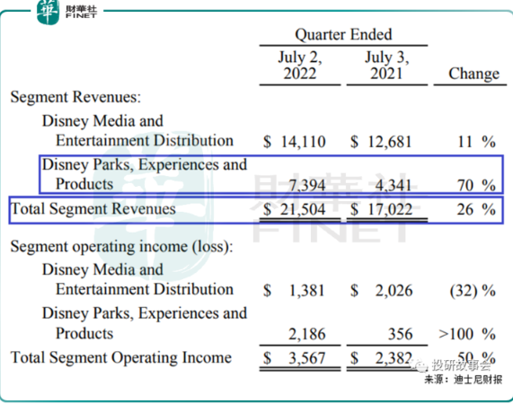 從迪士尼業(yè)務(wù)構(gòu)成的角度來(lái)看,迪士尼的娛樂(lè)帝國(guó)龐大而穩(wěn)固。在財(cái)務(wù)報(bào)告中,迪士尼將主營(yíng)業(yè)務(wù)分為兩大部分,包括媒體和娛樂(lè)發(fā)行(DMED)和公園、體驗(yàn)和產(chǎn)品(DPEP)。