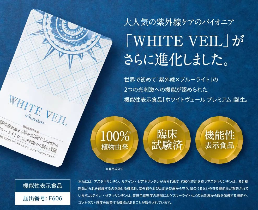 2021年4月,日本品牌ZERO PLUS推出世界上首款聲稱具有保護(hù)皮膚和眼睛免受紫外線 、藍(lán)光等光刺激的功能性表示食品White Veil Premium。