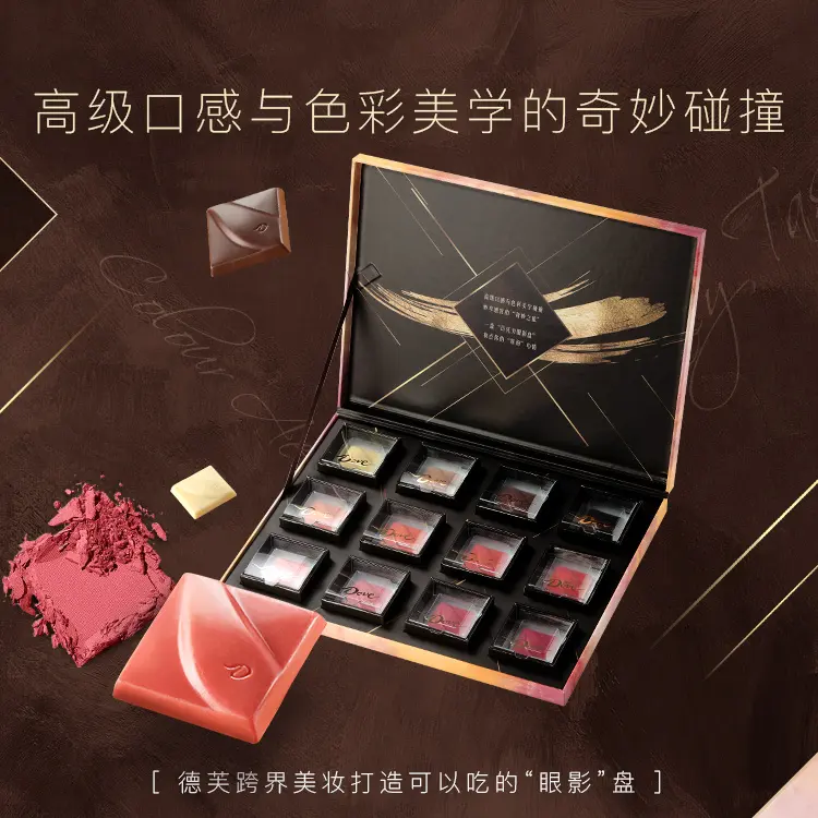 2020年德芙首次將巧克力跨界彩妝推出繽紛眼影盤巧克力,打造首個“可以吃的眼影盤”。