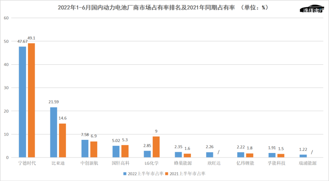 2022年1-6月國(guó)內(nèi)動(dòng)力電池廠商市場(chǎng)占有率排名及2021年同期占有率,數(shù)據(jù)來源于中國(guó)汽車動(dòng)力電池產(chǎn)業(yè)創(chuàng)新聯(lián)盟,連線出行制圖