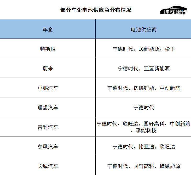 部分車企電池供應(yīng)商分布情況,資料來源于公開資料,連線出行制表