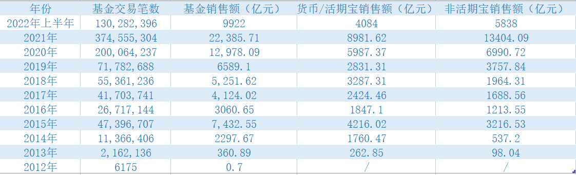 從代銷的基金數(shù)量來看,天天基金基本實現(xiàn)了公募產(chǎn)品的全覆蓋。 截至2022年6月30日,共上線151家公募基金管理人14,358只基金產(chǎn)品。公司互聯(lián)網(wǎng)金融電子商務平臺共計實現(xiàn)基金認(申)購(含定投)交易130,282,396筆,其中非貨幣型基金共計實現(xiàn)認(申)購(含定投)交易109,753,298筆。