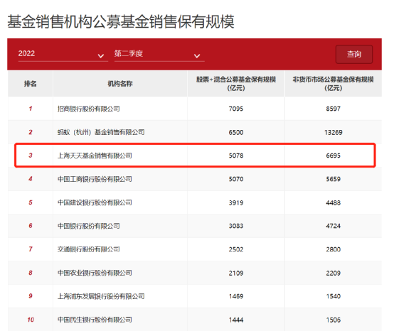 截至二季度末,天天基金的非貨、公募基金保有規(guī)模達到6695億元,位居第三位。