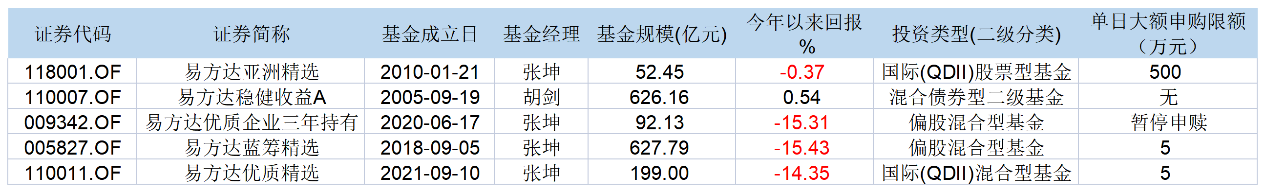 張坤管理的四只基金中,除了易方達(dá)優(yōu)質(zhì)企業(yè)三年持有仍處于封閉期外,易方達(dá)藍(lán)籌精選、易方達(dá)優(yōu)質(zhì)精選保持著單日5萬元的申購上限。