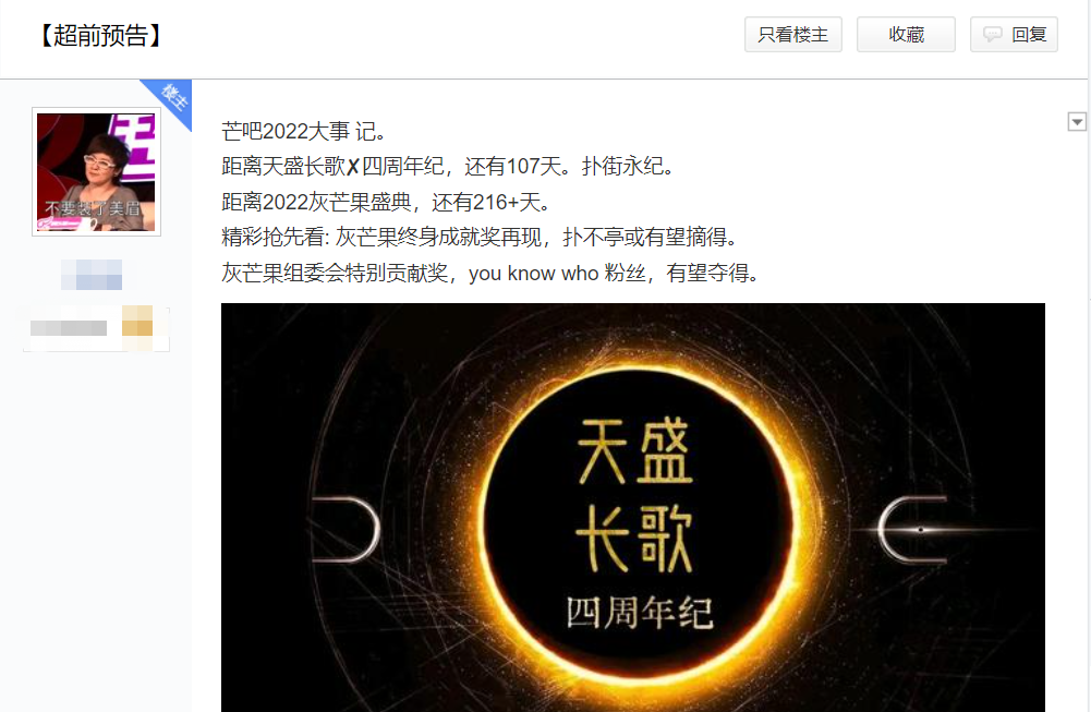三個(gè)多月前,湖南衛(wèi)視吧里的芒果精預(yù)告并預(yù)測(cè),《天盛長(zhǎng)歌》有望在今年的“灰芒果盛典”上摘得大獎(jiǎng)。(“灰芒果盛典”是芒果精每年自發(fā)組織的,以收視率為標(biāo)準(zhǔn)的盛典。)