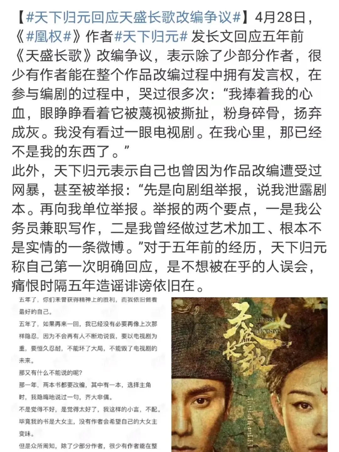 今年四月,《天盛長(zhǎng)歌》原著作者發(fā)長(zhǎng)文回憶當(dāng)年遭遇:原著大女主作品被迫改為大男主。演員粉向劇組舉報(bào)作者泄露劇本,但作者當(dāng)時(shí)早已離組。之后粉絲又向單位舉報(bào)作者身為公務(wù)員兼職寫作,同時(shí)還造謠、辱罵其家人,組團(tuán)到豆瓣給原著打低分。