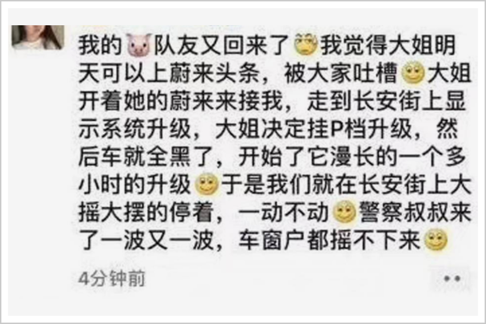 2019年1月,一輛蔚來ES8在北京長安街的車流中,“趴”了一個(gè)多小時(shí),原因是車機(jī)系統(tǒng)升級導(dǎo)致全車電源關(guān)閉,這件事當(dāng)時(shí)還上了熱搜。