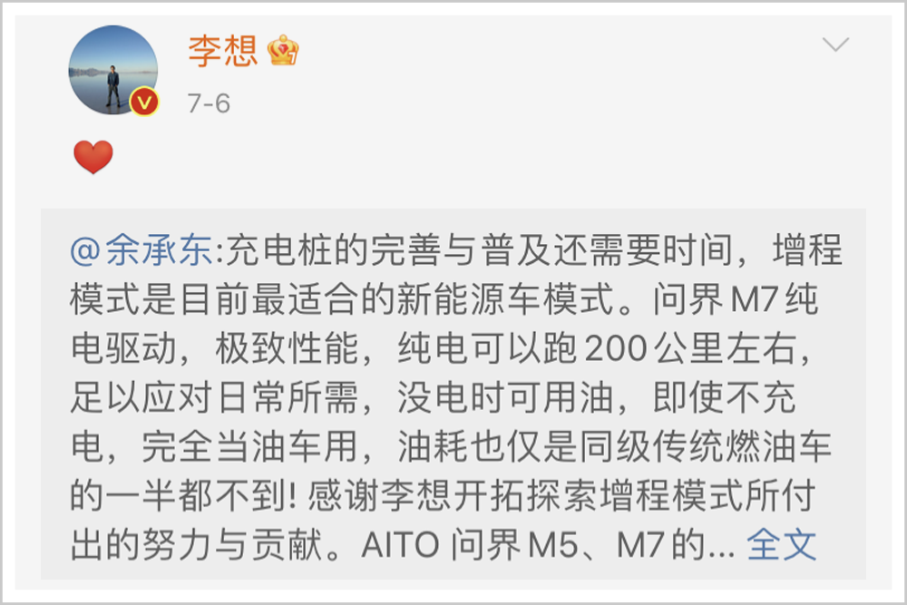 2022年7月6日,由華為主導(dǎo)開發(fā)的增程式混動(dòng)車問界M7上市,發(fā)布會(huì)后余承東發(fā)微博表示“增程式是目前最適合的新能源模式”,李想還轉(zhuǎn)發(fā)此條微博并“比心”。