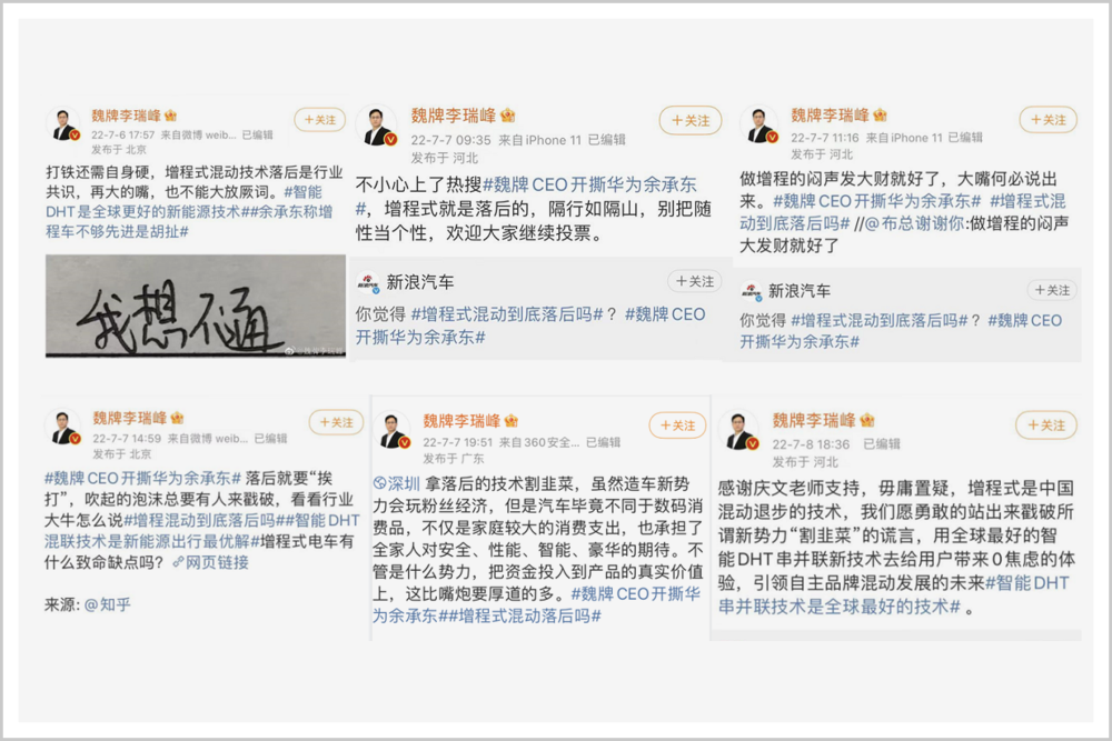 兩人“大秀恩愛”,卻徹底激怒了魏牌CEO李瑞峰,在2天內(nèi),李總連發(fā)6條微博狂懟增程式,并多次出現(xiàn)“落后技術(shù)”和“割韭菜”等字眼。