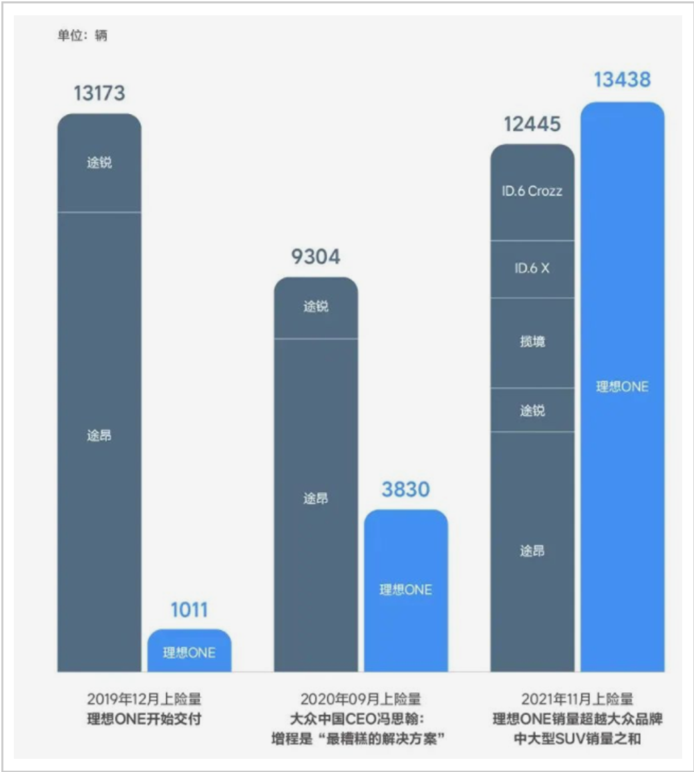 2021年12月,理想汽車官方突然在微博曬出一張圖片,表示理想ONE銷量已經(jīng)超過大眾集團(tuán)所有同級別車型銷量之和。李想終于成功復(fù)仇馮思瀚,一雪前恥。