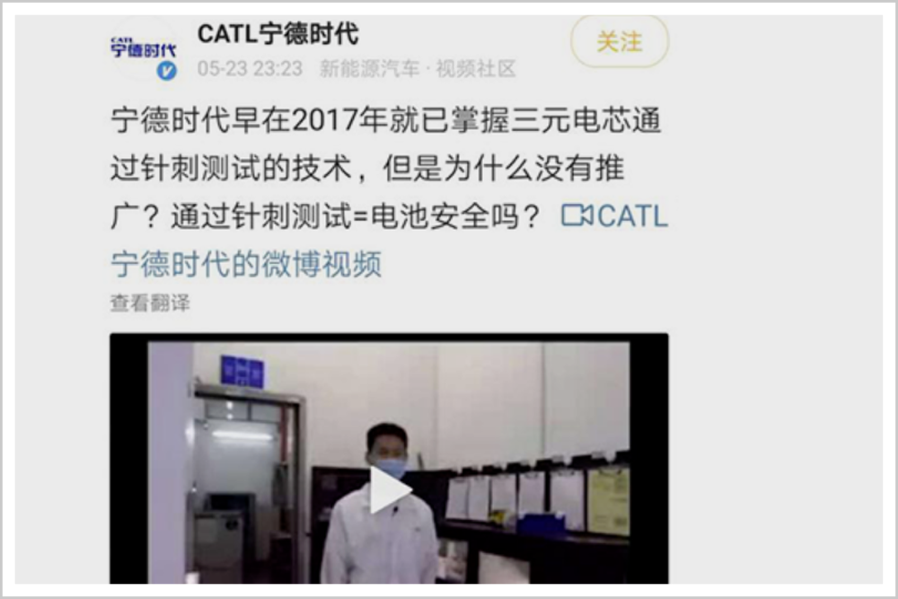 一周后,寧德時(shí)代放出兩個(gè)大料:一是自己的兩款三元鋰電芯通過針刺實(shí)驗(yàn)的視頻;二是旗下產(chǎn)品早在2017年就已通過德國萊茵鋰電池安全測試認(rèn)證(核心手段之一就是針刺測試)的文件。