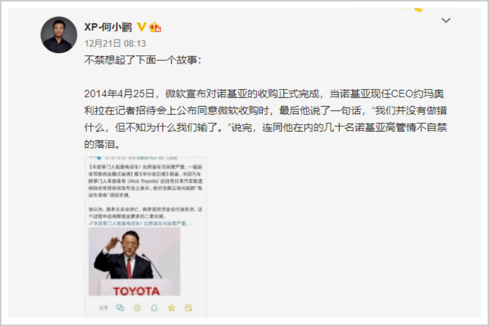 此言一出,引發(fā)了國內(nèi)媒體的群嘲,何小鵬還在微博上用諾基亞的例子暗諷豐田是“老古董”。