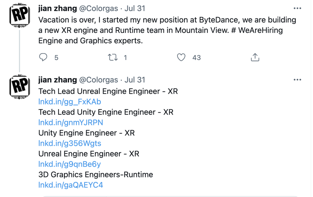 此前外媒曾報道,曾任Meta軟件高級工程師的Jian Zhang已經(jīng)跳槽至字節(jié)跳動,并為字節(jié)跳動旗下的VR頭顯品牌Pico建立新團(tuán)隊。Jian Zhang還在推特發(fā)文,“我們正在山景城建立一個新的XR引擎和運行團(tuán)隊?!?/p>