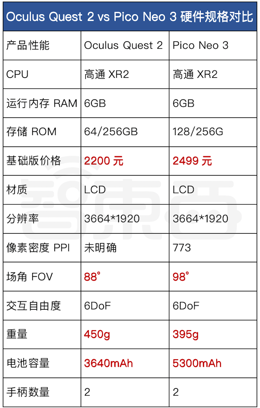 ▲漲價之前,Oculus Quest 2 vs Pico Neo 3硬件規(guī)格對比