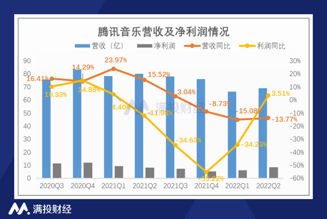 結(jié)合騰訊音樂近幾個季度的營收和凈利潤來看,可以看到,從21年Q2開始公司的收入就陷入了同比下滑的區(qū)間,甚至在21年Q4開始出現(xiàn)同比負(fù)增長,至今已經(jīng)連續(xù)三個季度收入同比下滑,宏觀環(huán)境的逆風(fēng)對騰訊音樂的營收影響非常明顯。