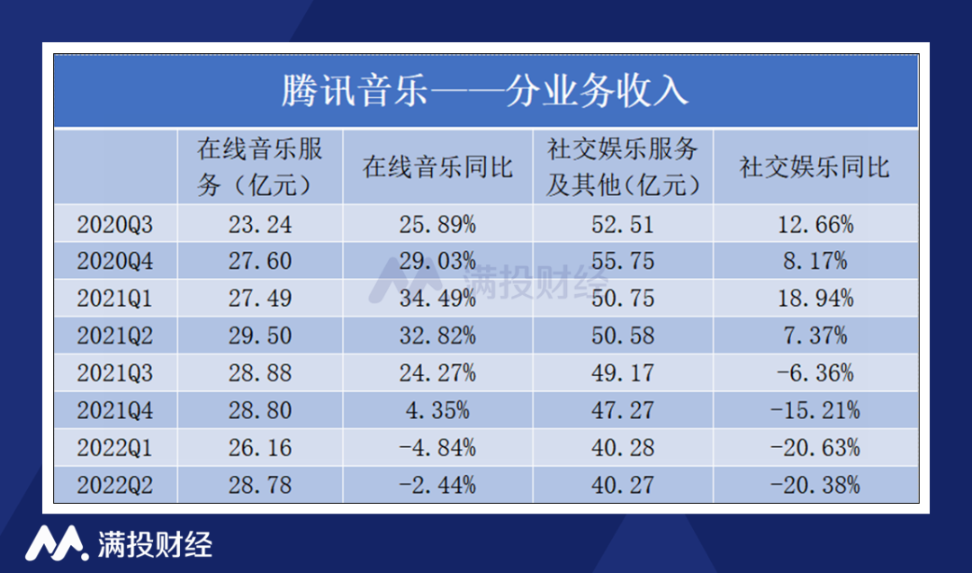 社交娛樂服務(wù)騰訊音樂最大的收入來源,這塊業(yè)務(wù)就像是一個巨大的流量蓄水池,在發(fā)揮音樂版權(quán)最大效用的同時,不斷地擴大用戶群體,與在線音樂業(yè)務(wù)形成聯(lián)動效益。但社交娛樂業(yè)務(wù)卻正在走下坡路,2021年下半年以來收入持續(xù)下滑,近兩個季度維持20%的降幅,成為騰訊音樂總收入下降的最大拖累,公司解釋主要是由于宏觀環(huán)境演變的影響以及來自其他平臺的競爭加劇。