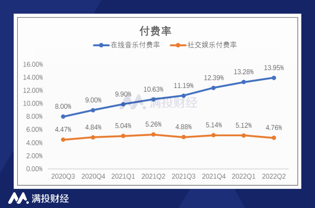 2022年二季度,騰訊音樂的在線音樂MAU為5.93億,同下降4.80%,社交娛樂MAU為1.66億,同比下降20.60%,兩大業(yè)務(wù)的MAU同比雙降,反映了行業(yè)競爭加劇下獲取新用戶的艱難。但付費用戶和付費率的增長,卻成為公司的主要經(jīng)營亮點。2022年二季度,公司在線音樂的付費用戶數(shù)量達到8270萬,同比增長24.90%,在線音樂的付費率進一步提高至13.95%,用戶粘性增加。而社交娛樂的付費用戶表現(xiàn)則差強人意,為790萬,同比下降28.30%。