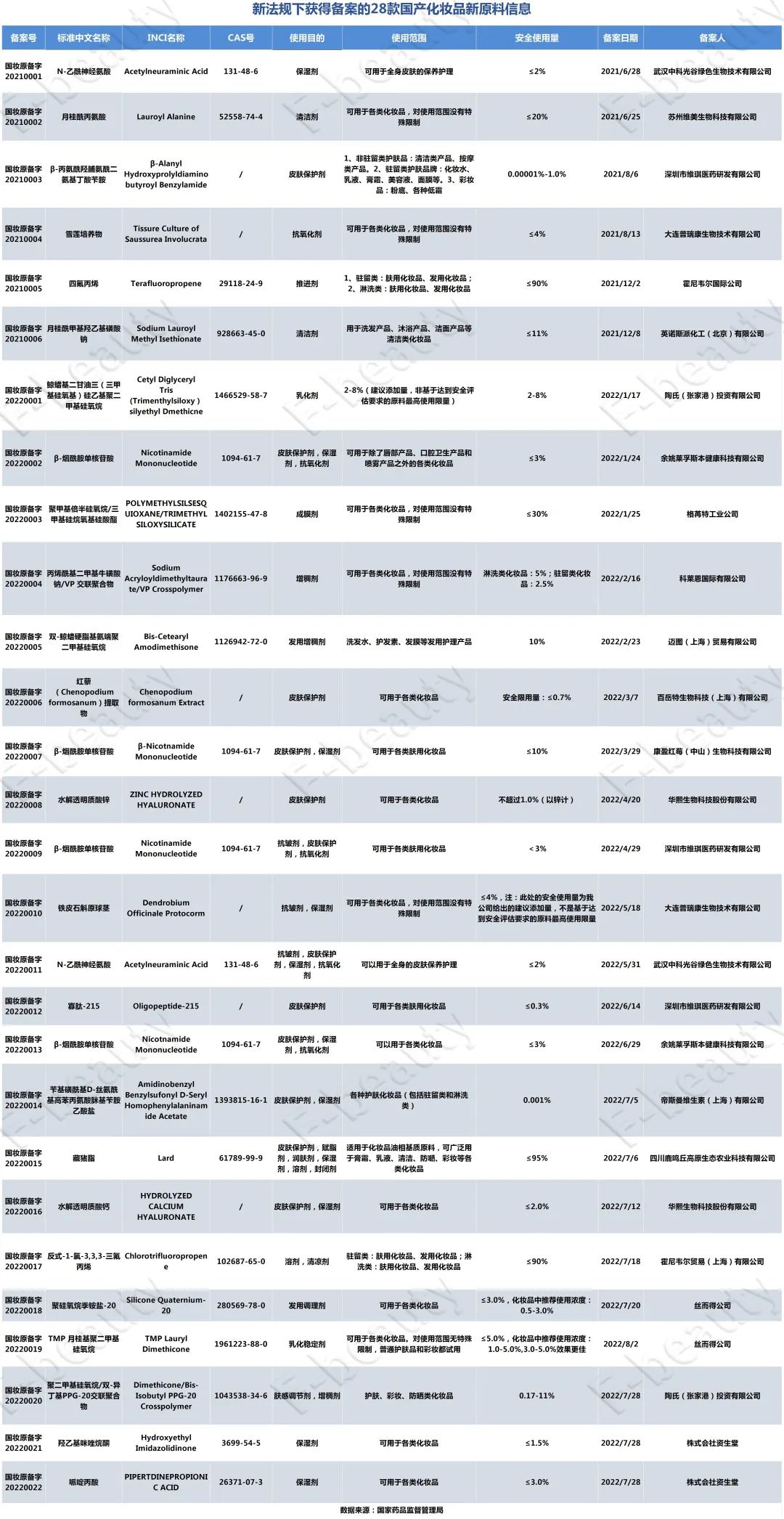 《未來(lái)跡Future Beauty》觀察到,自新法規(guī)實(shí)施以來(lái),2021年5月1日至2022年8月16日,已經(jīng)有23款化妝品新原料完成注冊(cè)備案,進(jìn)入監(jiān)測(cè)期。