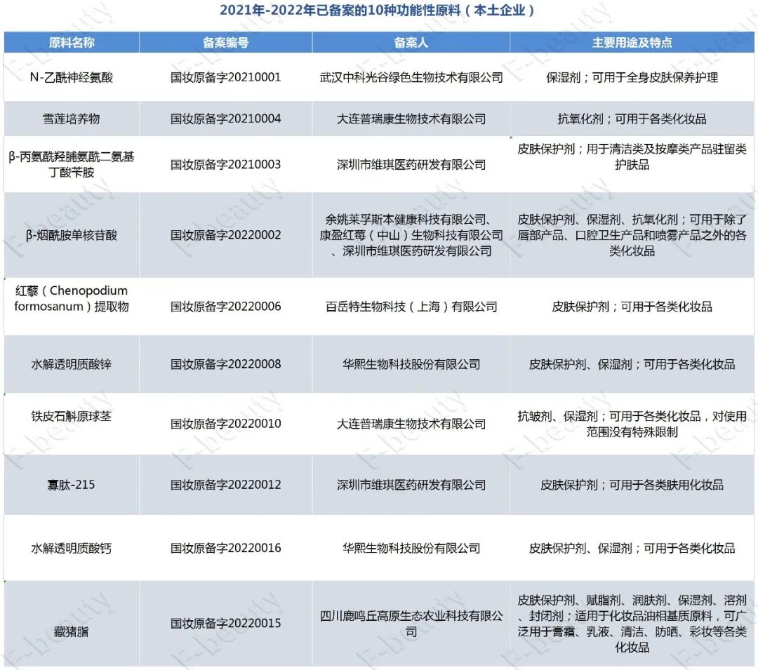 2021年注冊(cè)備案的新原料共6款,其中001-004號(hào)均來(lái)自本土生物技術(shù)企業(yè)。2022年注冊(cè)的17款新原料中,有14款來(lái)自本土企業(yè)。
