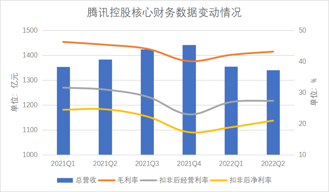 從核心財(cái)務(wù)數(shù)據(jù)變動(dòng)情況看,2021年騰訊控股的總營(yíng)收逐季提升,但毛利率、扣非后經(jīng)營(yíng)利率和扣非后凈利率均呈逐漸走低的趨勢(shì),有些許“增收不增利”的跡象。