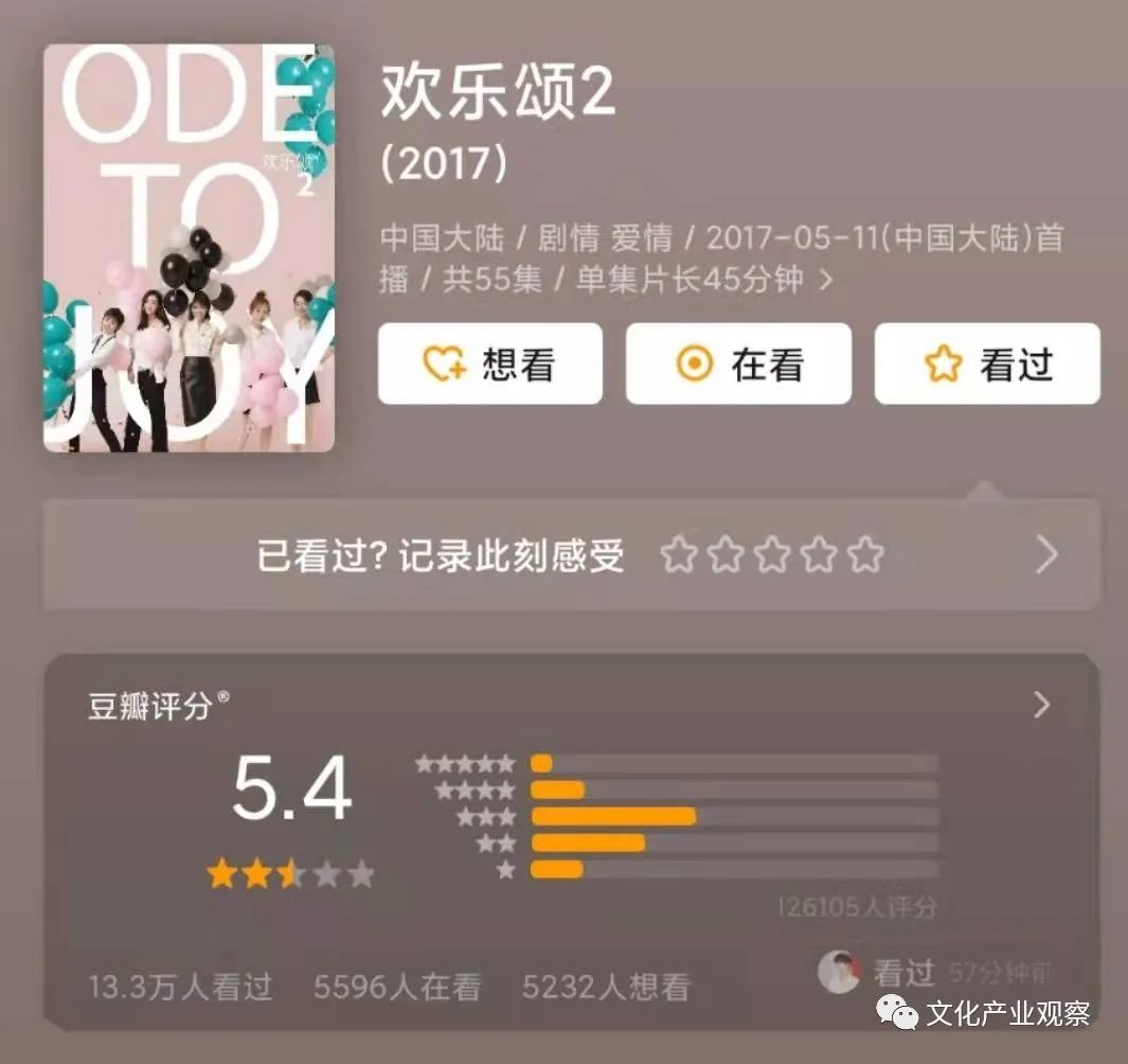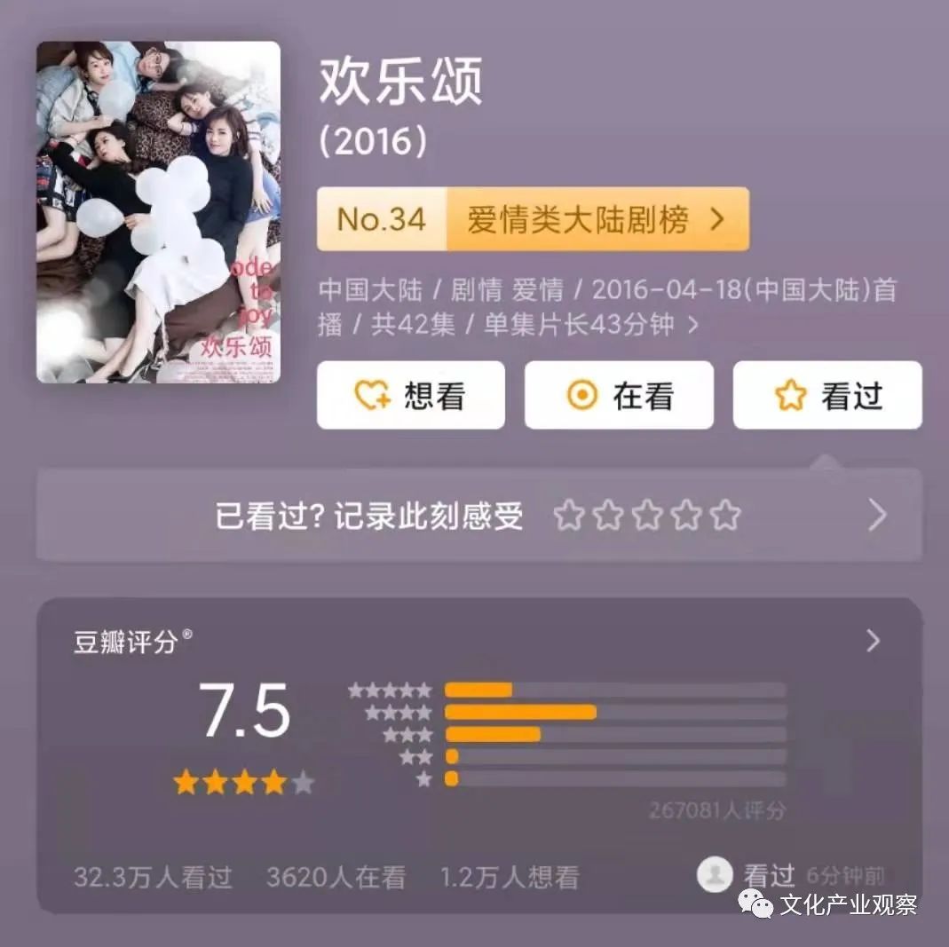 作為“歡樂頌IP”的第三部,無論是口碑還是熱度都敵不過其前兩部。自2016年《歡樂頌1》播出之后,豆瓣評(píng)分穩(wěn)定在7.5,盡管仍存在某些雷點(diǎn),但這第一部又是多少人心中的白月光呢?