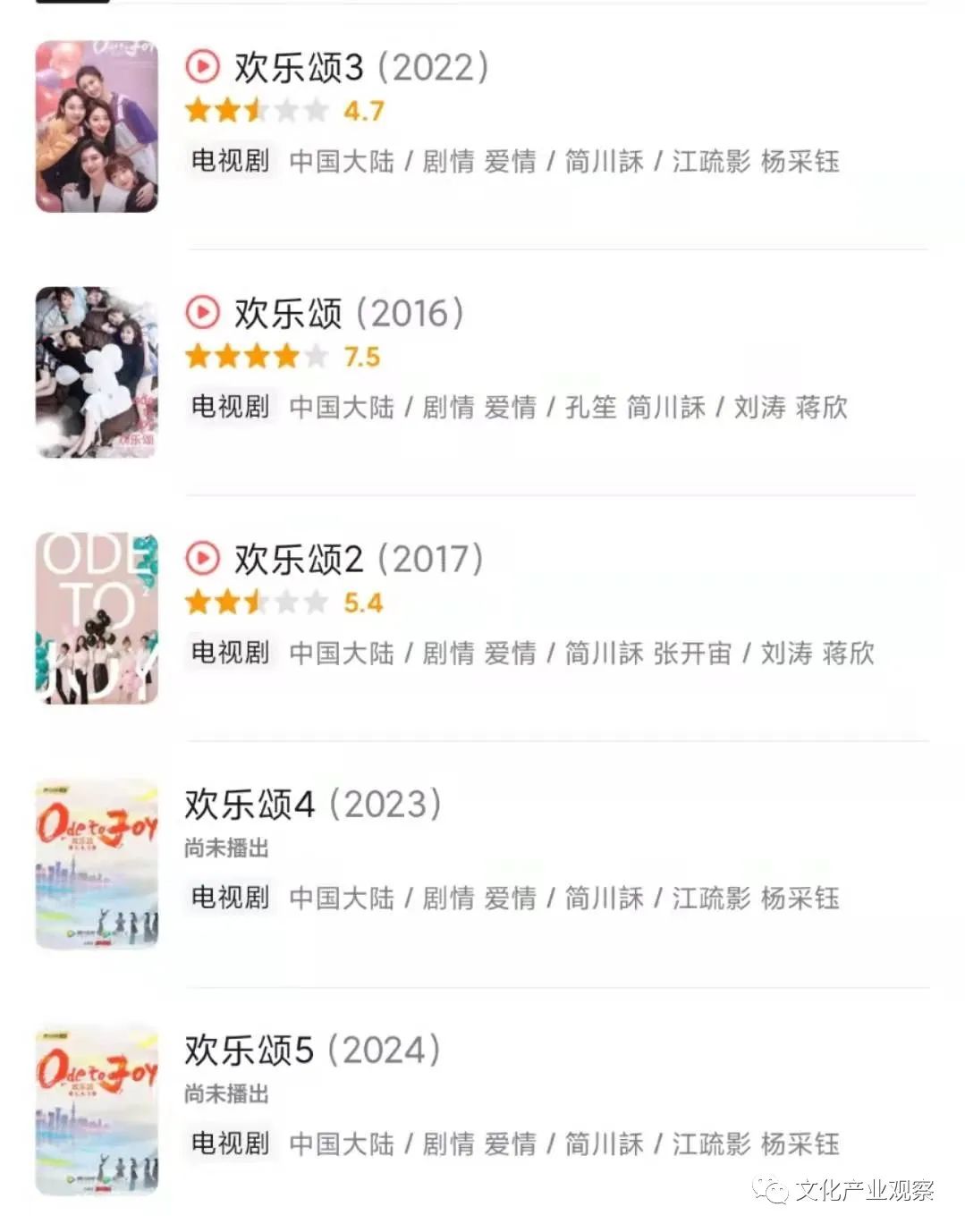 然而,本該完美結(jié)束的“歡樂系列”卻又重啟,硬生生的搞出來了一個(gè)“尷尬三連”,可以看到,在搜《歡樂頌3》時(shí),第4部、第5部也在準(zhǔn)備階段。