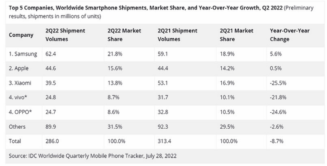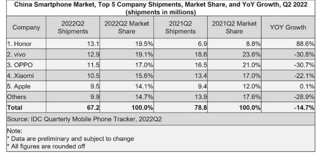 疫情反復(fù)下,中國手機(jī)市場也顯得孱弱。中國信通院數(shù)據(jù)顯示,今年國內(nèi)智能手機(jī)的出貨量已經(jīng)下滑至7年前的水平。IDC則表示,2022年二季度中國市場除蘋果銷量微增0.1%外,Vivo、OPPO和小米全線下滑。