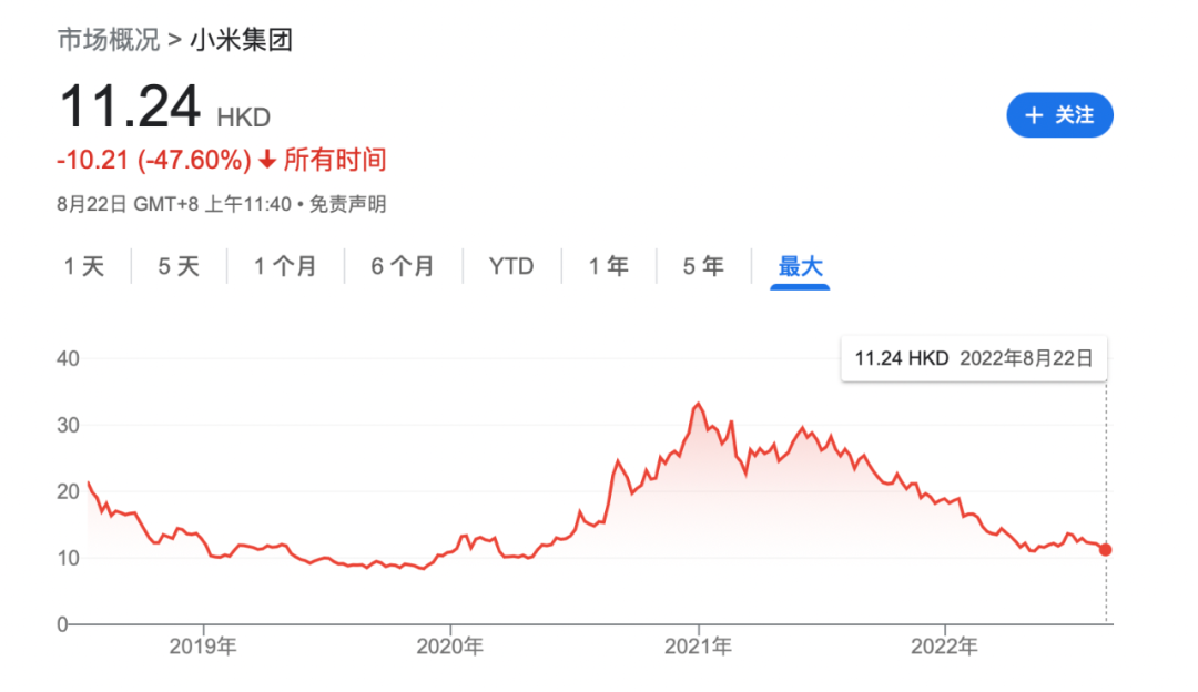 但2022年全球大環(huán)境驟變,小米境況已然不同。今年7月6日,小米兩款新機(jī)型發(fā)售,但小米不似以往高調(diào),銷售戰(zhàn)報不見蹤影。而截至發(fā)稿前,小米公司股價已經(jīng)跌到最近的11.24港元/股,市值2805億港元,相比去年頂峰跌去68%。