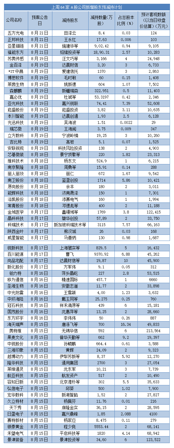 上周(8月15日至8月21日),A股公司預減持規(guī)模有所減少。據界面新聞不完全統(tǒng)計,共有64家A股公司披露股東減持計劃。