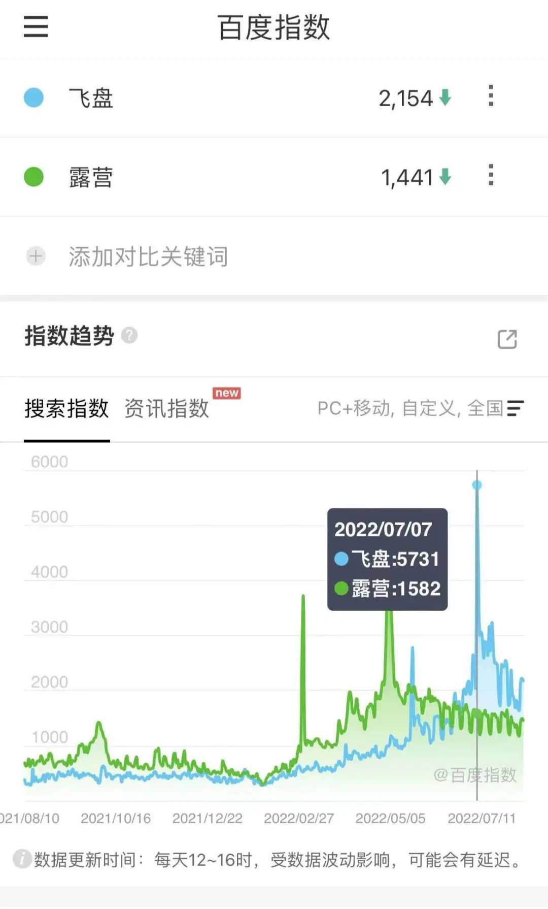 百度指數(shù)顯示,在1年前的8月11日,飛盤和露營的搜索數(shù)據(jù)分別為298和628。而到了今年,露營和飛盤的搜索小高峰分別達(dá)到了4125和5731,與去年8月相比分別增長了556.8%和1800%。