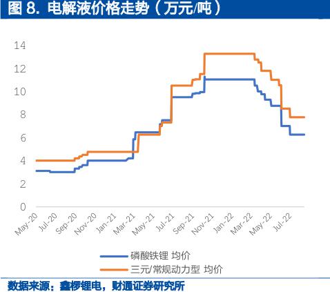 不過進(jìn)入二季度后,鋰離子電池電解液價格逐漸下降,截至7月份已回落至6萬元/噸左右,較3月份下降約45%。