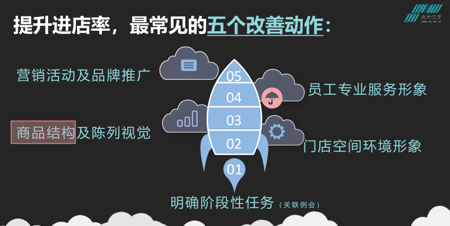 明確五類(lèi)消費(fèi)群體之后,就有機(jī)會(huì)采用不同的方式和方法,有針對(duì)性地吸引消費(fèi)者進(jìn)店。其中五類(lèi)常用的改善動(dòng)作分別是:門(mén)店空間環(huán)境形象、商品結(jié)構(gòu)和陳列視覺(jué)、階段性的任務(wù)的設(shè)置(例會(huì))、營(yíng)銷(xiāo)活動(dòng)和品牌推廣,以及員工專(zhuān)業(yè)服務(wù)形象等。